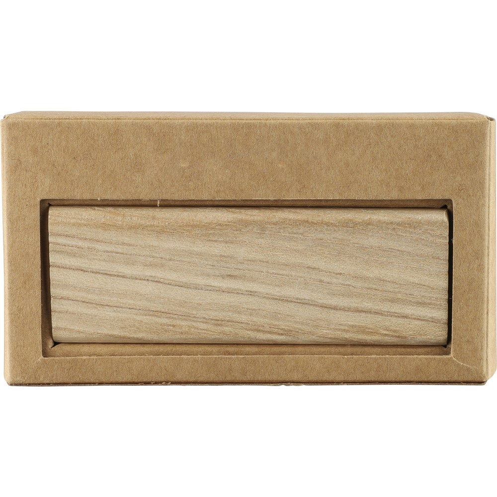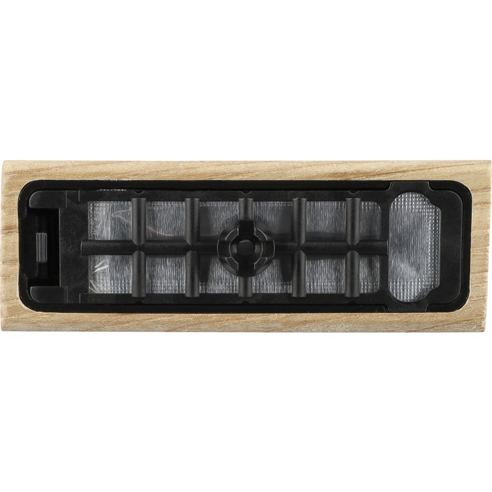 Natúr bükkfából készült autós légfrissítő, 2 × 3 g alkoholmentes szantálfa illattal (egy előre töltve, egy utántöltőként). ABS csipesszel ellátva a szellőzőrácsra történő rögzítéshez. Illusztrációval ellátott barna kartondobozba csomagolva.