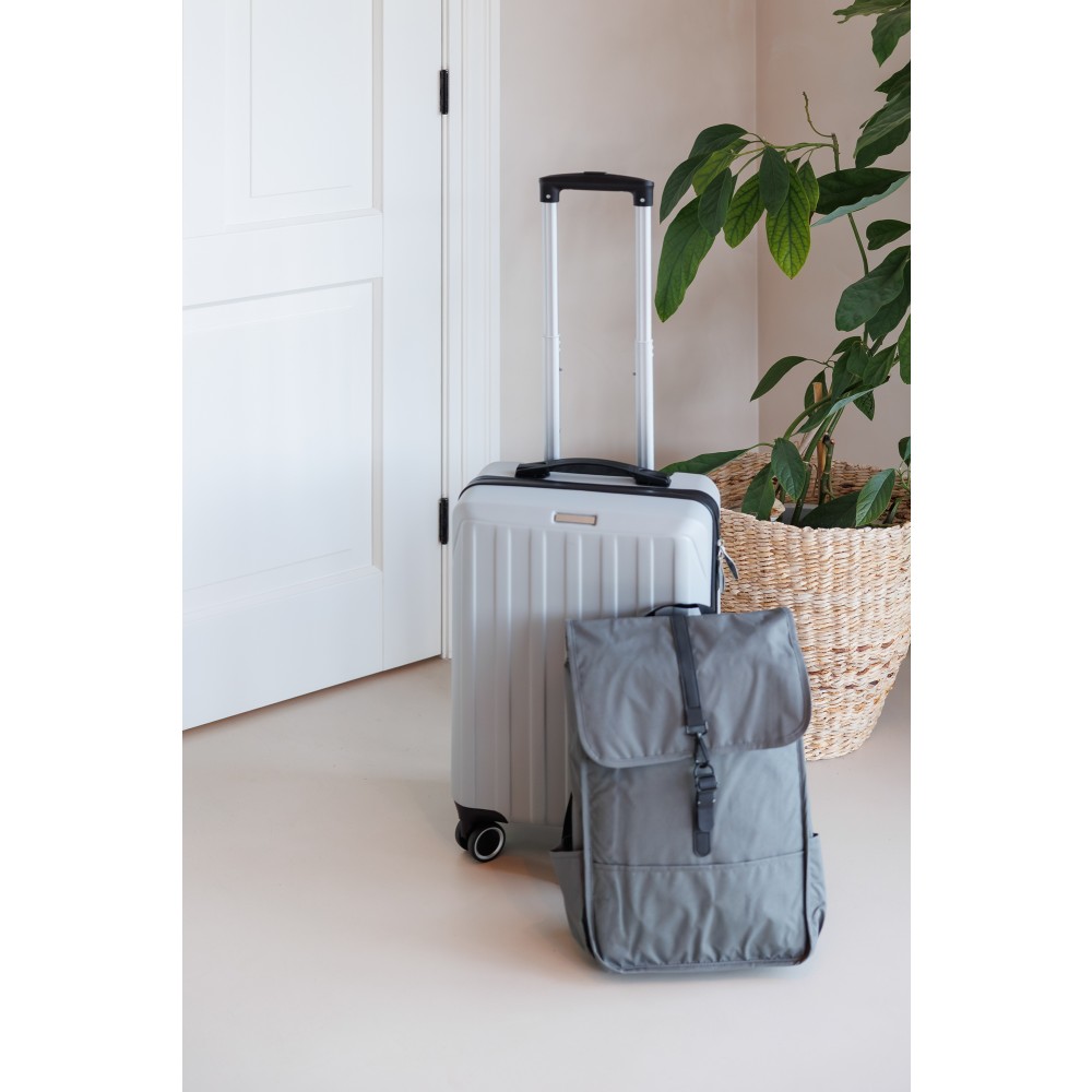Keményfedeles ABS gurulós bőrönd 8 kerékkel (4x2), és háromszintű fém fogantyúrendszerrel. Felső műanyag fogantyút, számkombinációs zárat és 3M ragasztócsíkkal rögzíthető gravírozható táblát tartalmaz. A belső bélés anyaga 210D, a táskán belül 3 rekesz áll rendelkezésre: U-cipzáras zseb, hálós zseb és X-alakú, csattal záródó gumis heveder. Űrtartalom: 30 liter. Csomagolása barna papírdoboz.