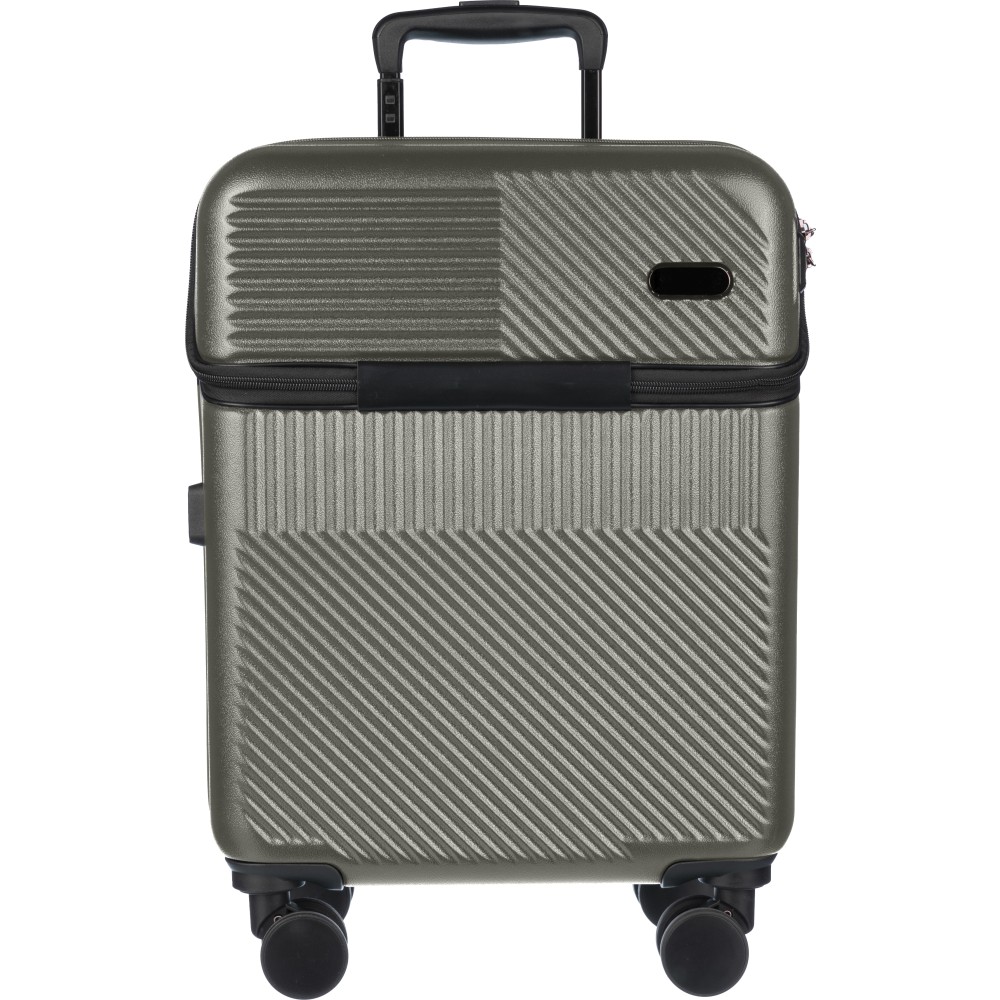 Gurulós bőrönd cipzáras laptop zsebbel, 8 kerékkel és háromszintű fogantyúrendszerrel. Beépített számzár és külön lapocska a lézergravírozáshoz. USB porttal.