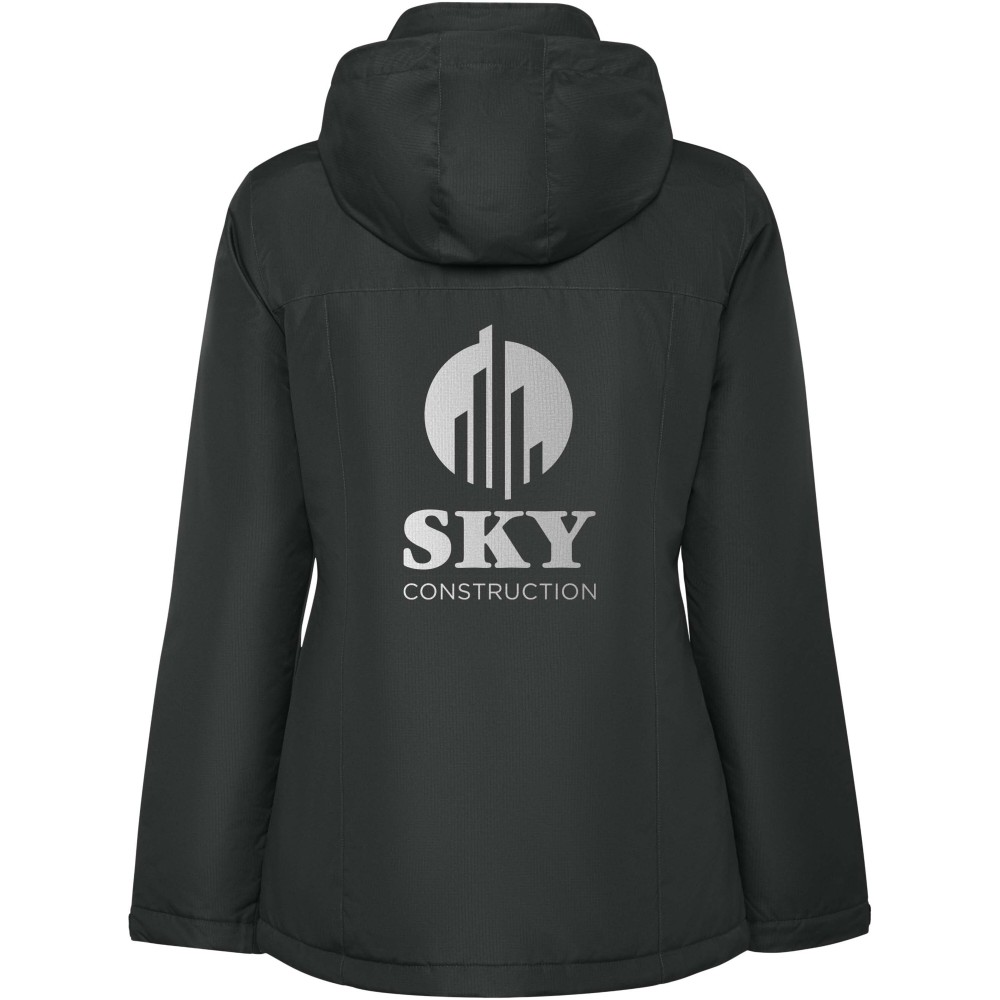 Vízálló bélelt parka nőknek. Karcsúsított fazon. Magas gallérral és levehető kapucnival, tépőzáras záródással. Oldalsó zsebek cipzárral, belső zseb tépőzáras záródással. Állítható mandzsetták tépőzáras övhurkokkal. Belső hozzáférés a hátsó és a bal mellkasi megerősítésekhez.