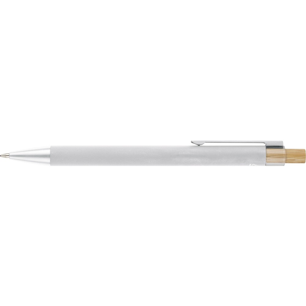 Újrahasznosított alumíniumból készült golyóstoll bambusz nyomógombbal és AS műanyag díszítéssel, fém klippel és a toll színével harmonizáló műanyag tollheggyel. A tolltesten lézergravírozott recycled (újrahasznosított) alapanyagra utaló logó található. Megközelítőleg 800 méter íráshosszúságú, kék színű tollbetéttel.
