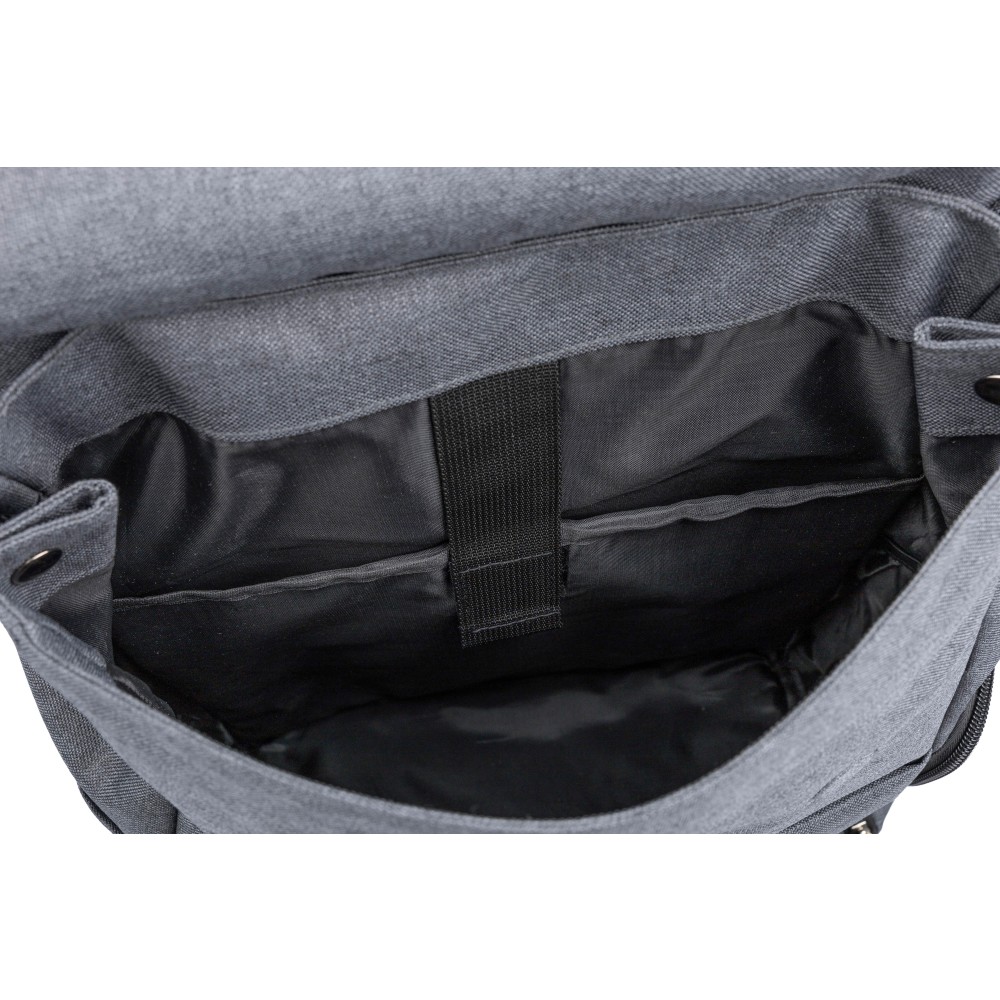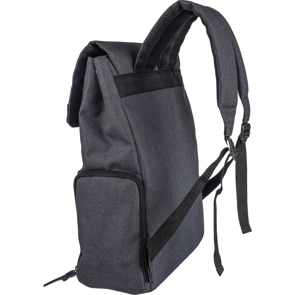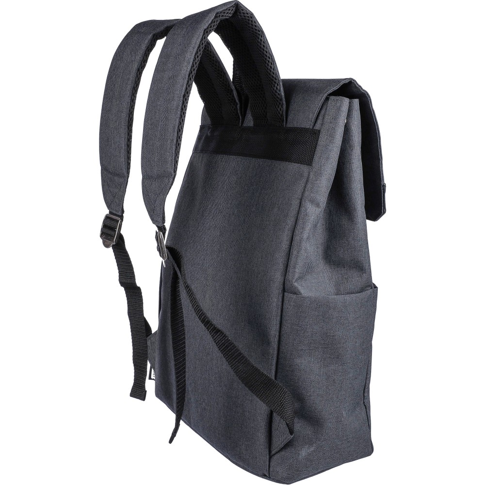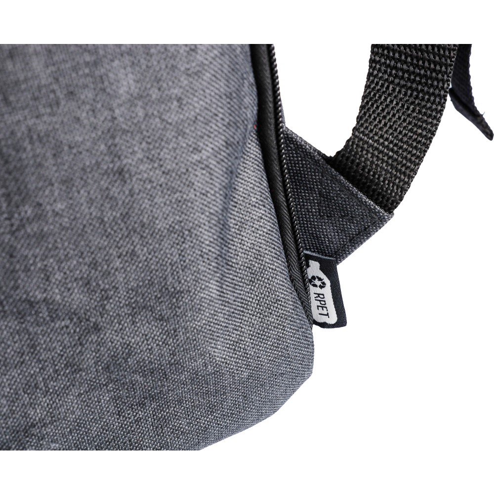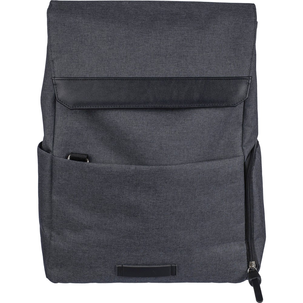 Laptophátizsák 15 -es laptop számára, PVC részletekkel és 210D béléssel. Kis cipzáras elülső zsebbel rendelkezik, benne egy kulcsokhoz rögzíthető karabinerrel, egy cipzáras oldalzsebbel, egy normál oldalzsebbel, valamint egy nagy, mágneszáras rekesszel, amely laptopzsebet tartalmaz. Oldalt nyomógombokkal zárható, ha nincs teljesen megtöltve. Állítható, szellőző pántokkal. Az elülső részen rPET anyagra utaló címke található. Anyaga: 600D poliészter vászon.