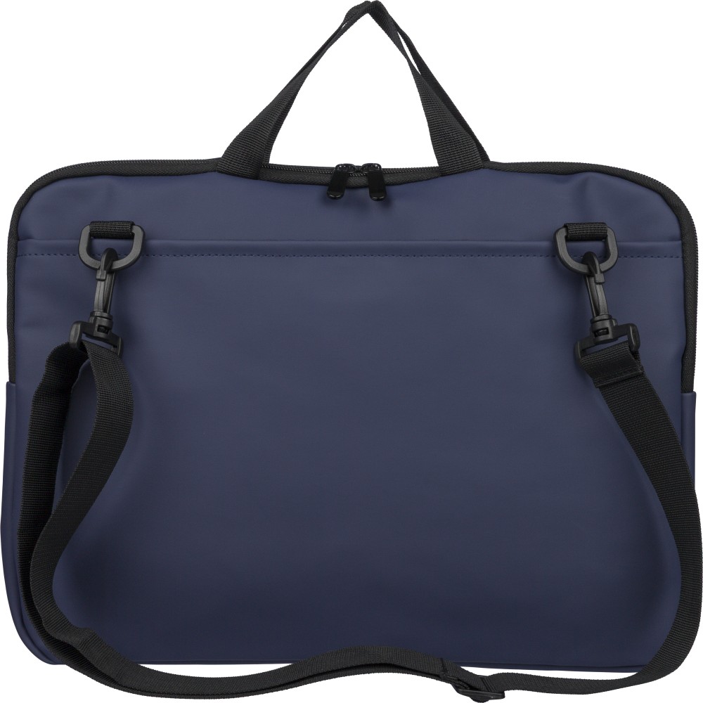 Újrahasznosított PU anyagból készült laptoptáska legfeljebb 15 hüvelykes készülékekhez, 4 mm vastag párnázással és 210D újrahasznosított béléssel. Elülső cipzáras zsebbel, hátoldali tépőzáras zsebbel, két rövid fogantyúval és állítható vállpánttal rendelkezik. A belső címkén újrahasznosított alapanyagra utaló logó található.