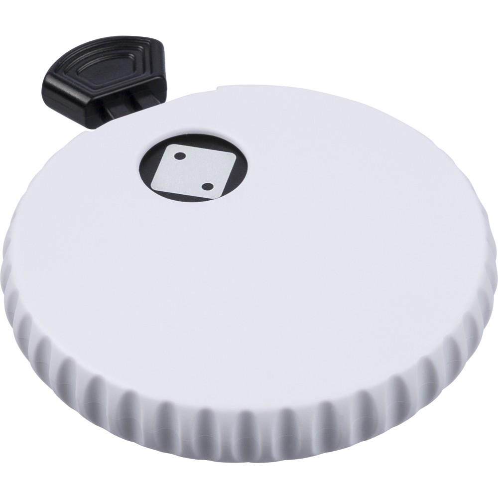 Újrahasznosított ABS-ből készült mechanikus dobókocka felső nyomógombbal. A gomb megnyomásával a mechanika véletlenszerűen jelenít meg egy 1?6 közötti számot. A hátoldalon sörnyitó található. A terméken Recycled ABS (újrahasznosított alapanyagra utaló) logó található. Újrahasznosított politasakba csomagolva.