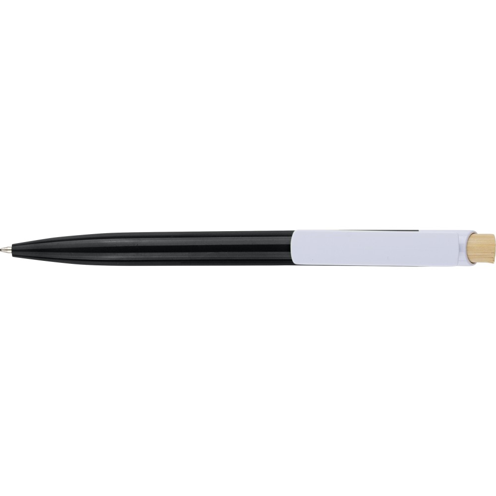 Újrahasznosított ABS-ből készült golyóstoll bambusz nyomógombbal és fehér klippel, digitális nyomtatásra alkalmas kivitelben. A tolltesten fröccsöntés során elhelyezett recycled (újrahasznosított) alapanyagra utaló logó található. Megközelítőleg 600 méter íráshosszúságú, kék színű tollbetéttel.