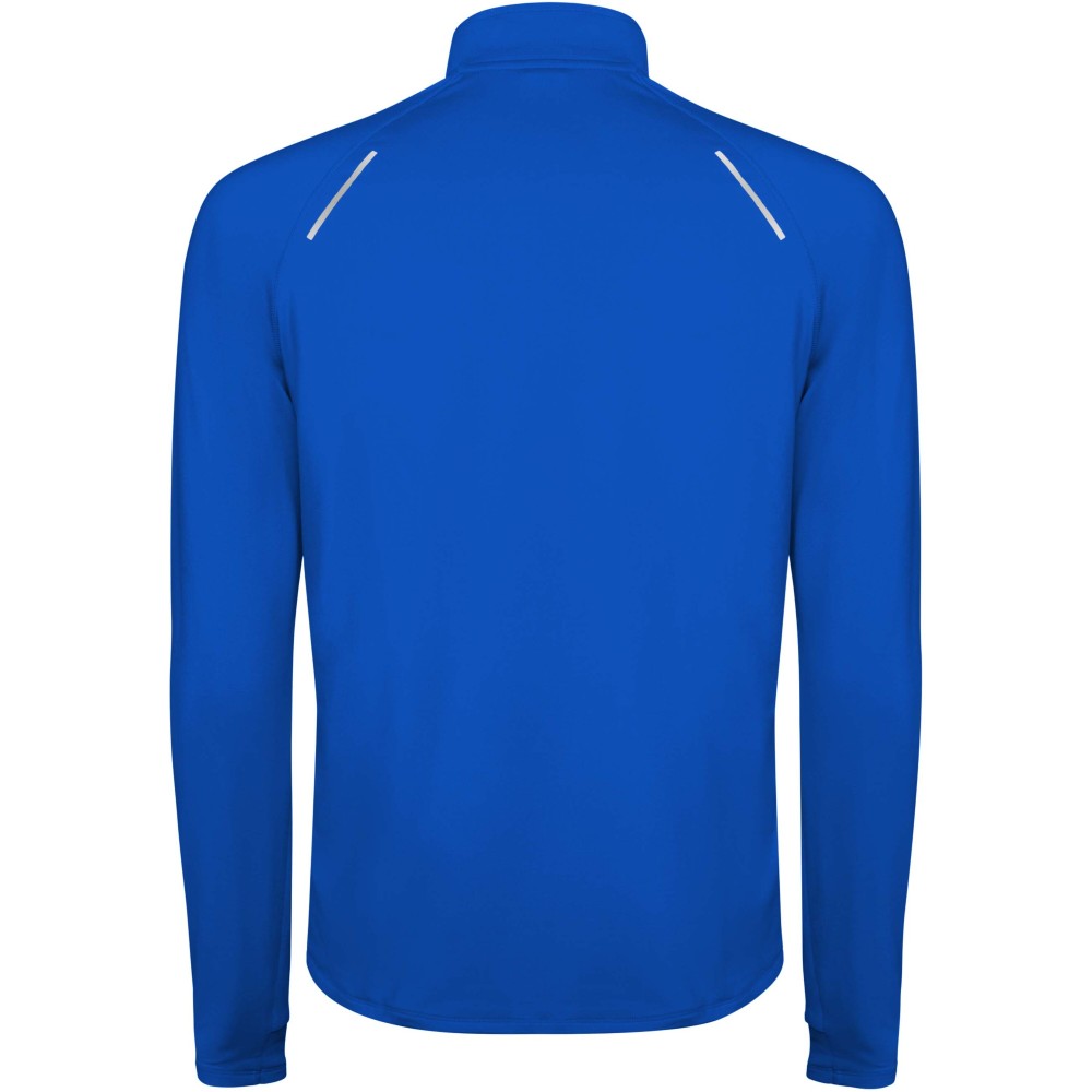 Férfi hosszúujjú technikai raglán pulóver. Gallér fordított félcipzárral, fényvisszaverő részletekkel. Erősített varrások. Mandzsetta hüvelykujj nyílással. Fényvisszaverő részletek a háton. A hátul enyhén hosszabb, mint elől. Meleg, bolyhos belső anyag.