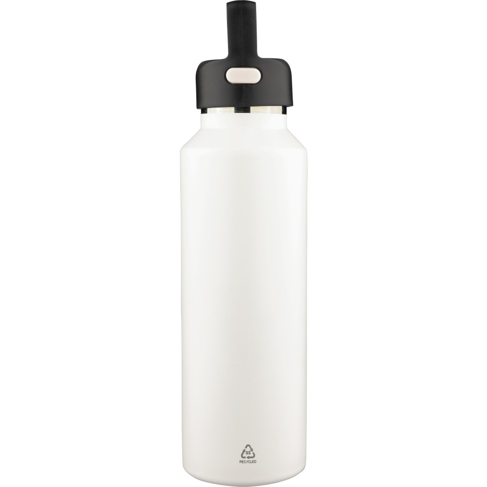 Újrahasznosított rozsdamentes acélból készült, vákuumszigetelésű palack 600 ml űrtartalommal, duplafalú kialakítással, hordozófüllel ellátott PP fedéllel és kétféle (dupla) nyitási lehetőséget biztosító nyomógombos rendszerrel. A palacktesten lézergravírozott recycled (újrahasznosított) alapanyagra utaló logó található. Darabonként barna kartondobozba csomagolva.