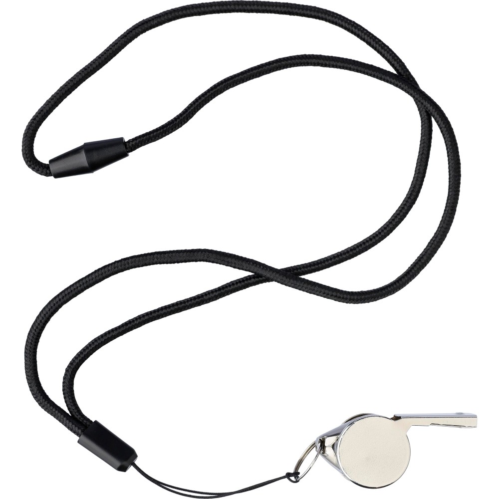 Síp poliészter zsinórral és műanyag biztonsági csattal. Egyenként barna kartondobozba csomagolva. Anyaga: fém.