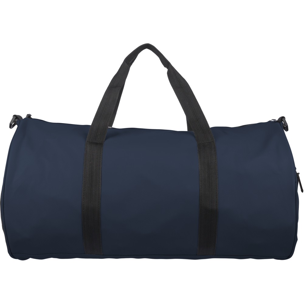 600D poliészterből készült rPET sporttáska 210D béléssel és vízlepergető PU bevonattal, 40 literes űrtartalommal. Elülső és oldalsó cipzáras zsebbel, hálós oldalzsebbel, két fogantyúval és állítható vállpánttal rendelkezik. Külső felületén rPET címkével ellátva.