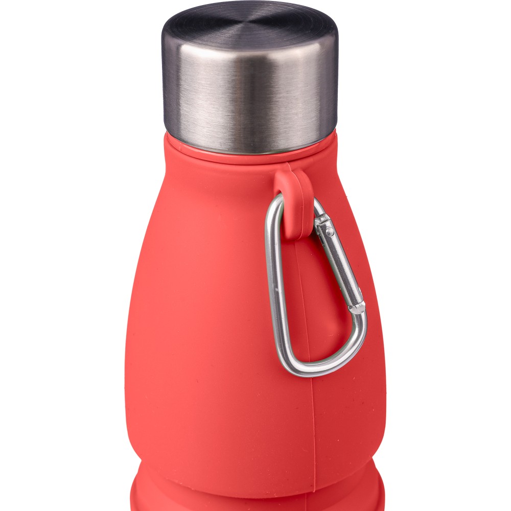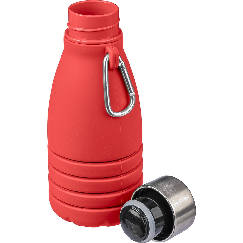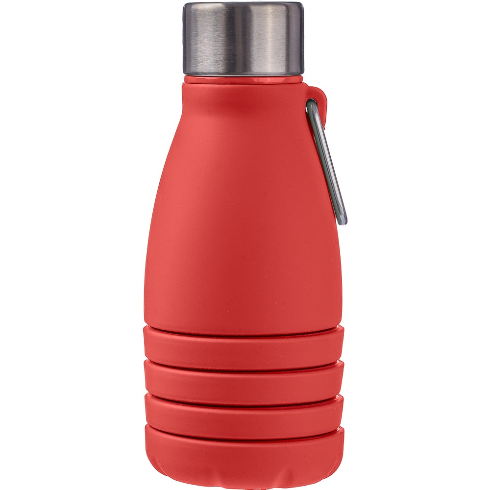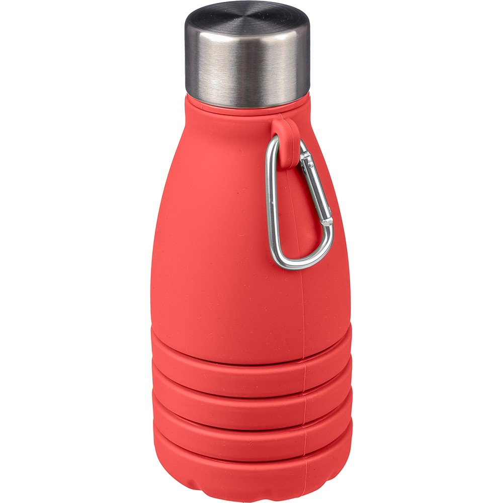 Összecsukható palack rozsdamentes acél fedéllel és alumínium karabinerrel. Összecsukott méret: d: 7x17 cm, kinyitott méret: d: 7x25 cm. Nincs egyenként csomagolva. Anyaga: szilikon. Űrtartalom: 550 ml.