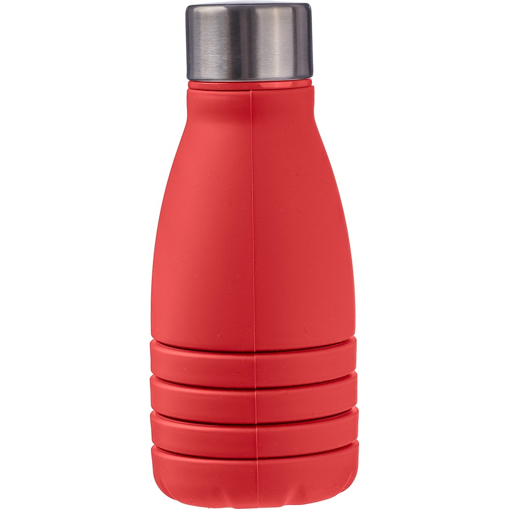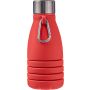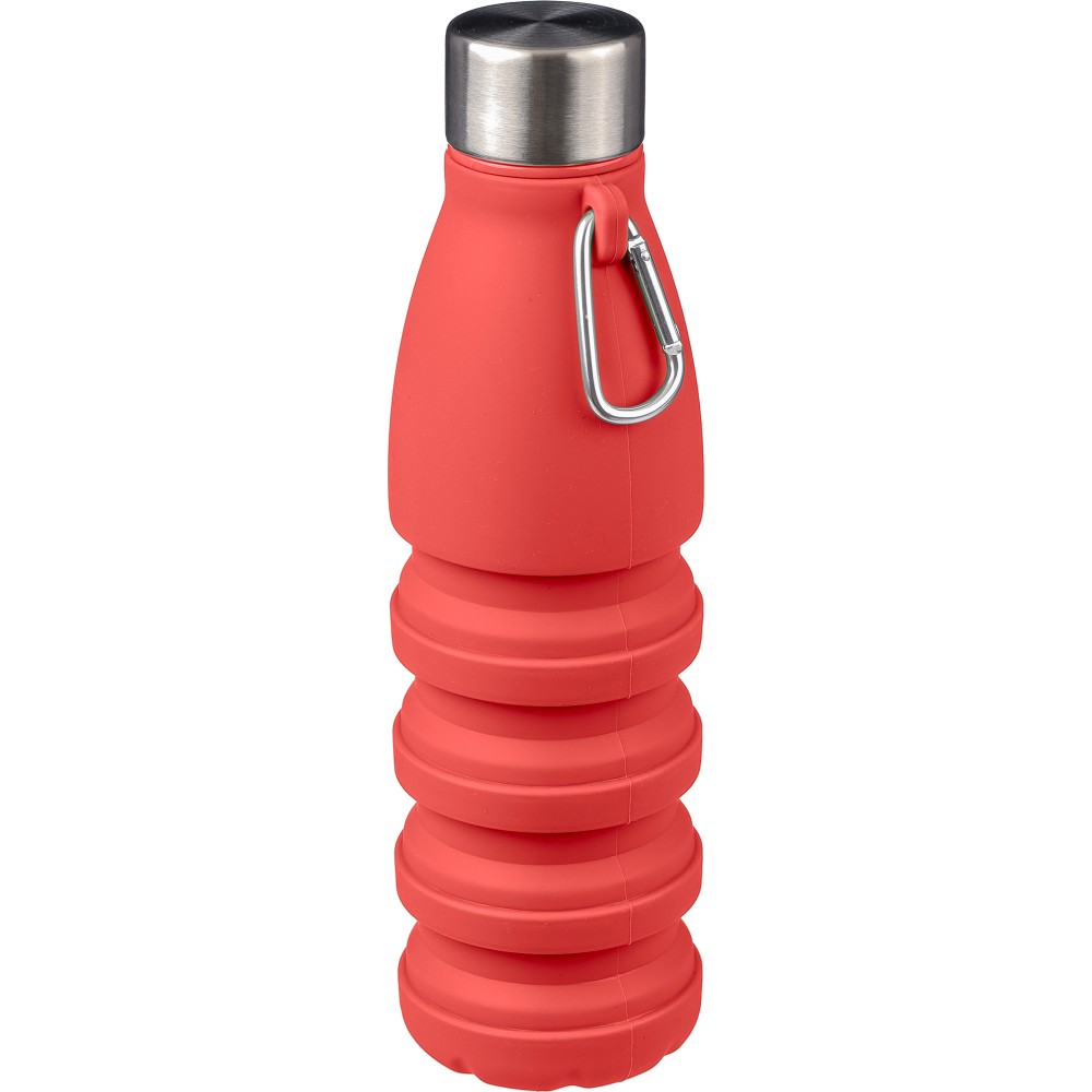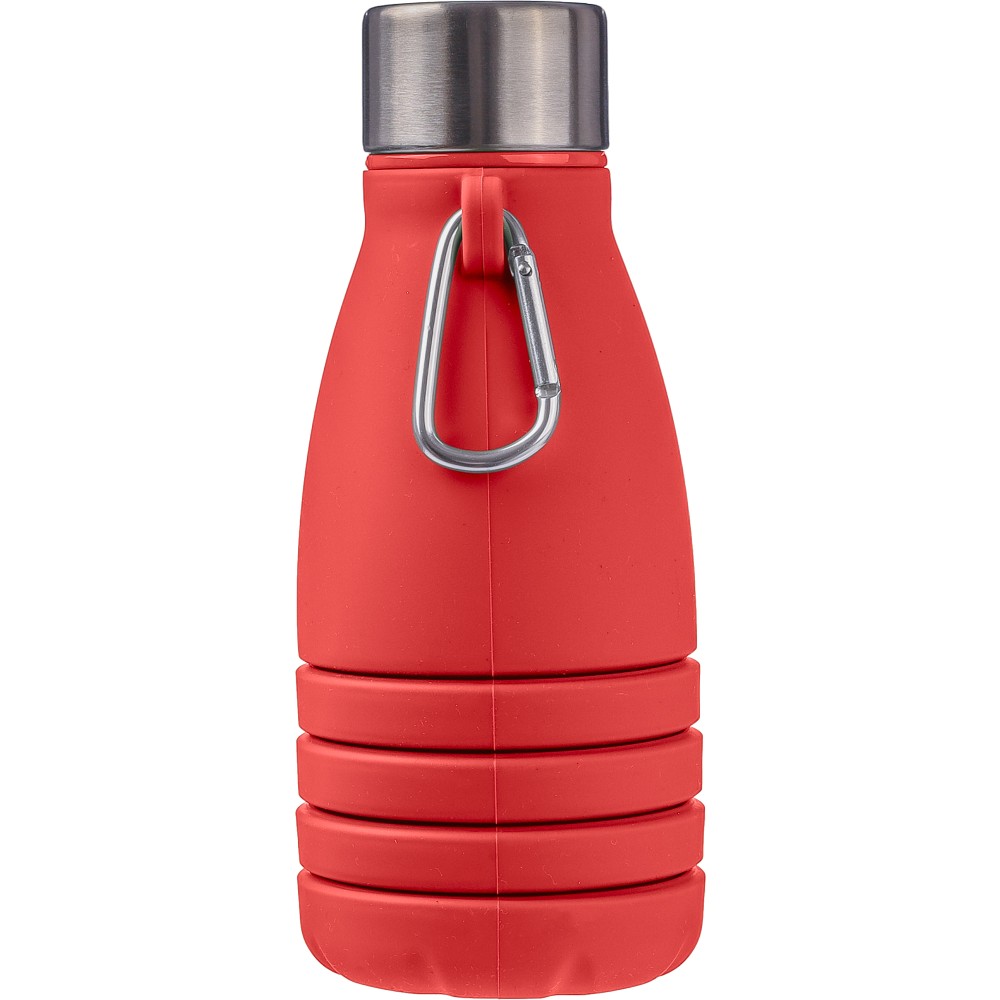 Összecsukható palack rozsdamentes acél fedéllel és alumínium karabinerrel. Összecsukott méret: d: 7x17 cm, kinyitott méret: d: 7x25 cm. Nincs egyenként csomagolva. Anyaga: szilikon. Űrtartalom: 550 ml.
