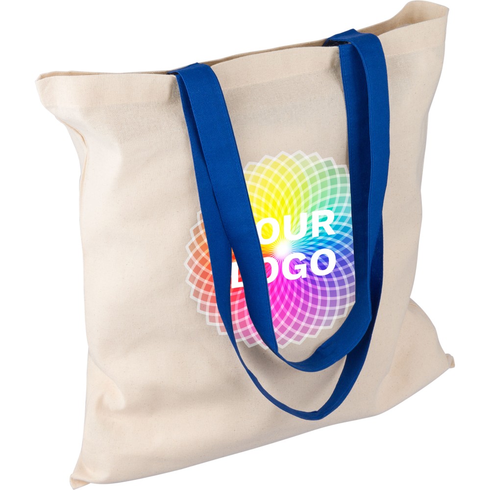 Oeko-Tex minősítésű, 140 g/m2 pamutból készült bevásárlótáska natúr színben, színes fülekkel. Mérete 38 × 42 cm, a fülek hossza 70 cm, szélessége 2,5 cm. Oeko-Tex címkével ellátva.