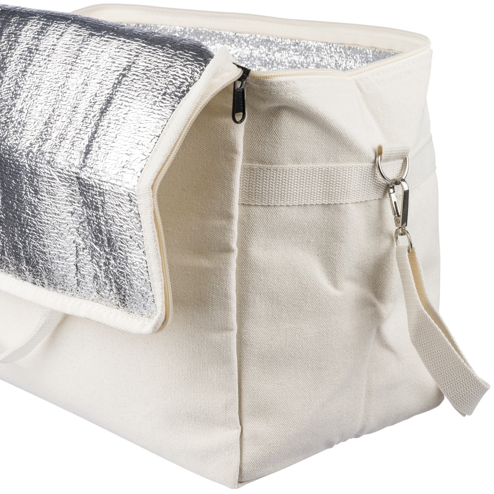 Újrahasznosított pamut-poliészter 330 g/m2 kevertszövetből készült hűtőtáska alumíniumfóliás szigeteléssel, 23 literes űrtartalommal. 60 cm hosszúságú és 3,5 cm szélességű fülekkel, 110 cm hosszúságú és 2,5 cm szélességű állítható vállpánttal, fémcsattal és a táska színével megegyező hevederrel rendelkezik. Külső felületén rPET címkével, belső részében további címkével ellátva.