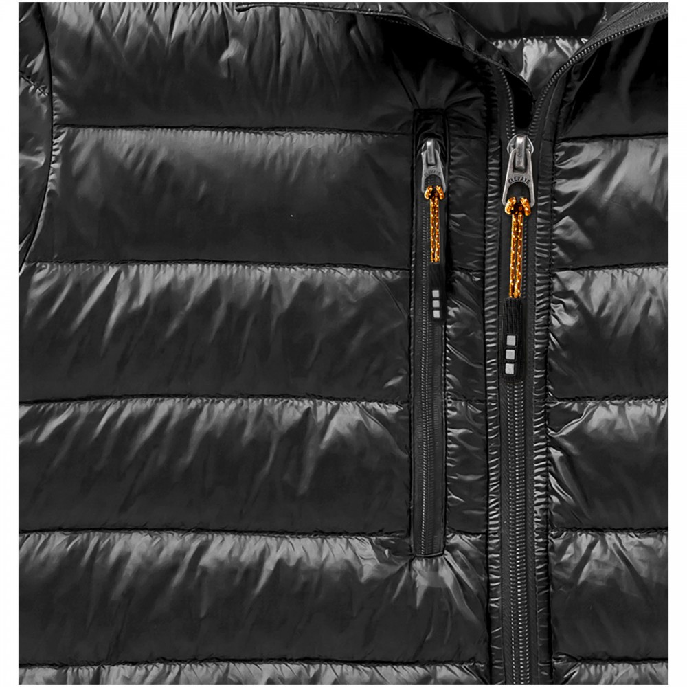 Normál szabásvonal. Pehelybiztos anyag. Cipzáros mell- és oldalzsebek. Szél elleni állvédő betét a nyaknál. Gumis szegély az aljon és a karöltőben. Vízlepergető, lélegző és szélálló. Hátul fényvisszaverő logónyomat . Könnyen megfogható cipzárhúzókák . A RedDot Design Díj nyertes Scotia dzsekivel megegyező minőség. 100% nylon, szőtt anyag, dupla vízlepergető bevonat, 20D. 80% pehely és 20% toll töltet.