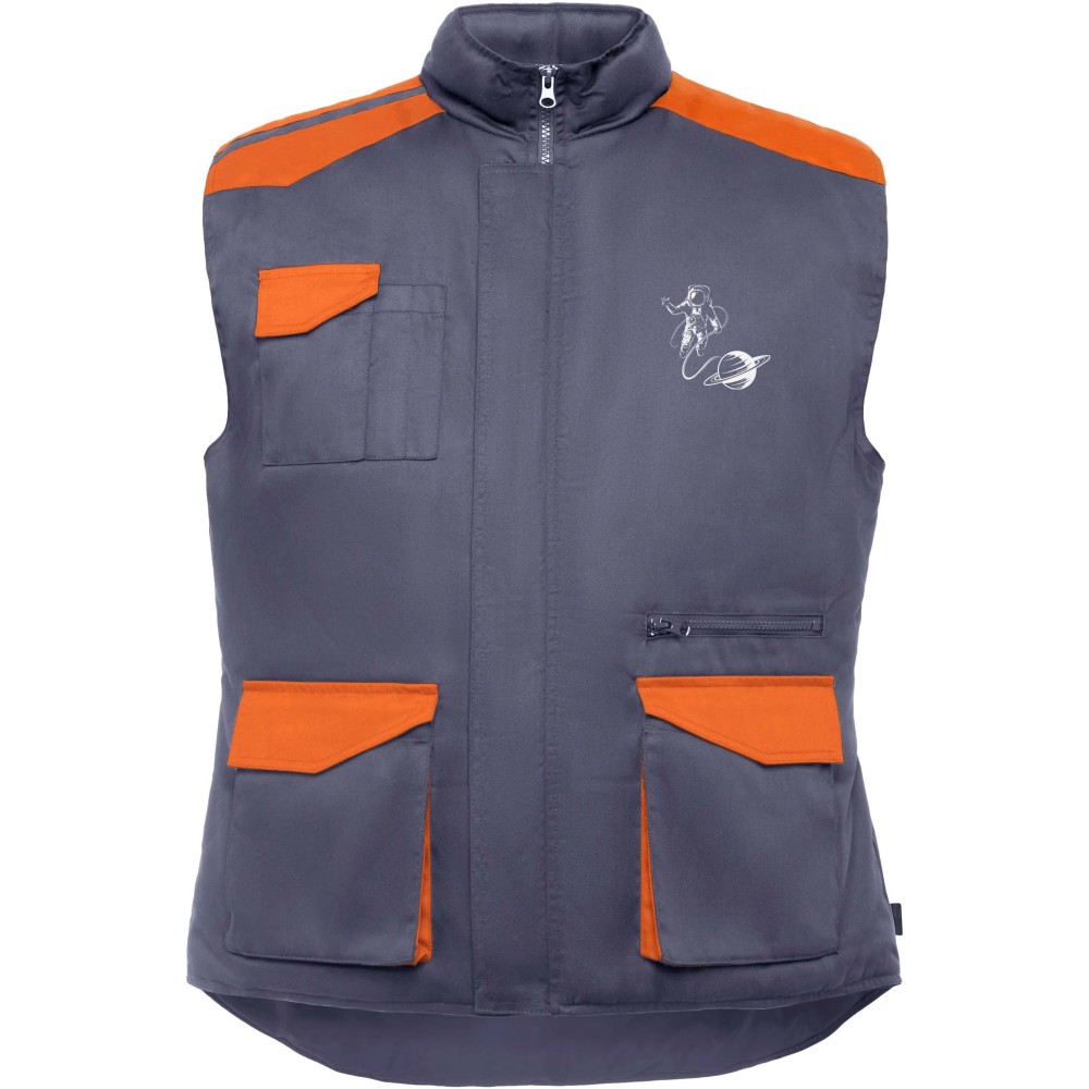 Magasított gallérral ellátott többfunkciós munkavédelmi mellény. Az elülső cipzárt tépőzáras hajtóka takarja, a karkivágások szélfogó belső passzéval készültek. A jobb oldalon tépőzáras külső mobiltelefontartó zseb található. A terméket két tépőzáras elülső zsebbel, két tolltartó rekesszel, egy tépőzáras belső zsebbel, valamint egy plusz cipzáras zsebbel látták el. A vállrészek és a részletek kontrasztos színű elemekkel díszítettek.