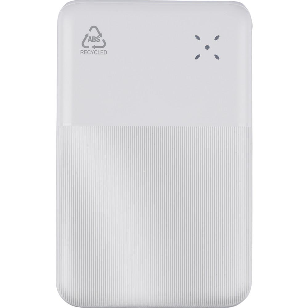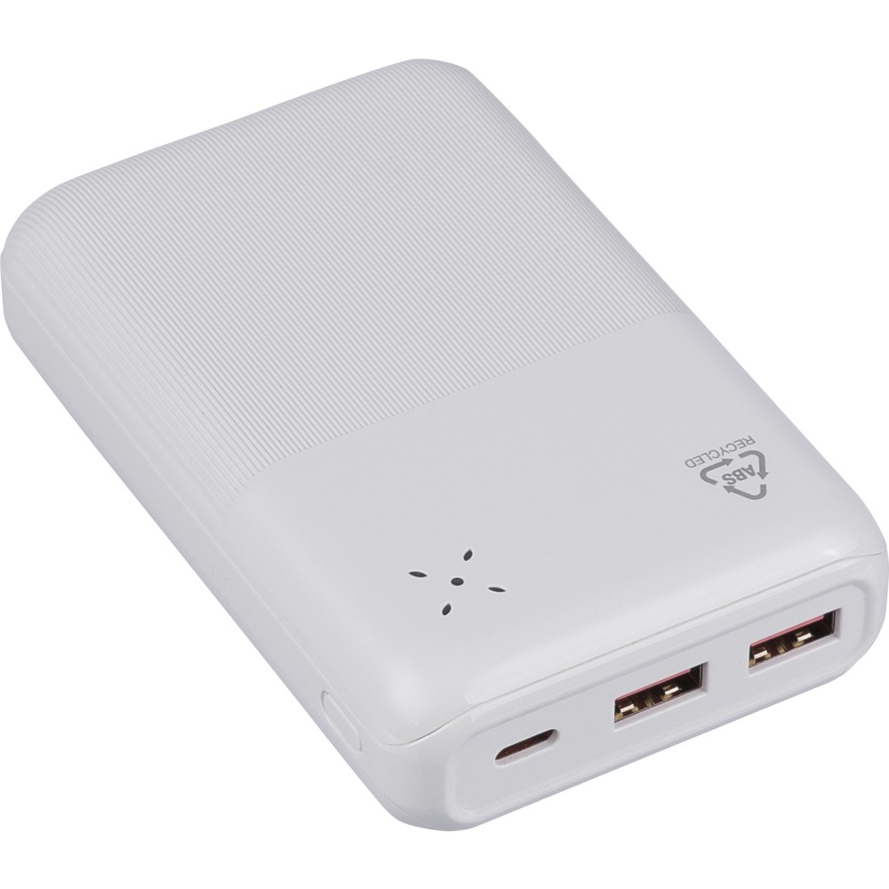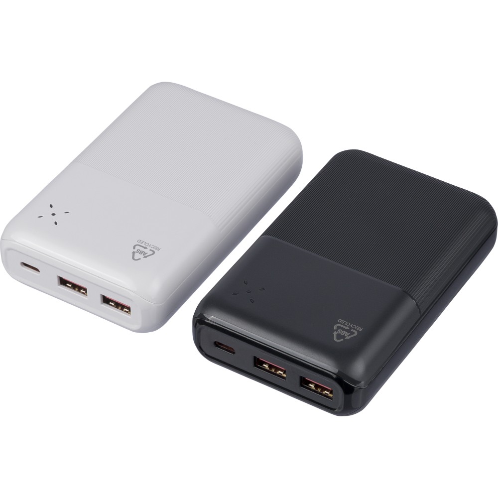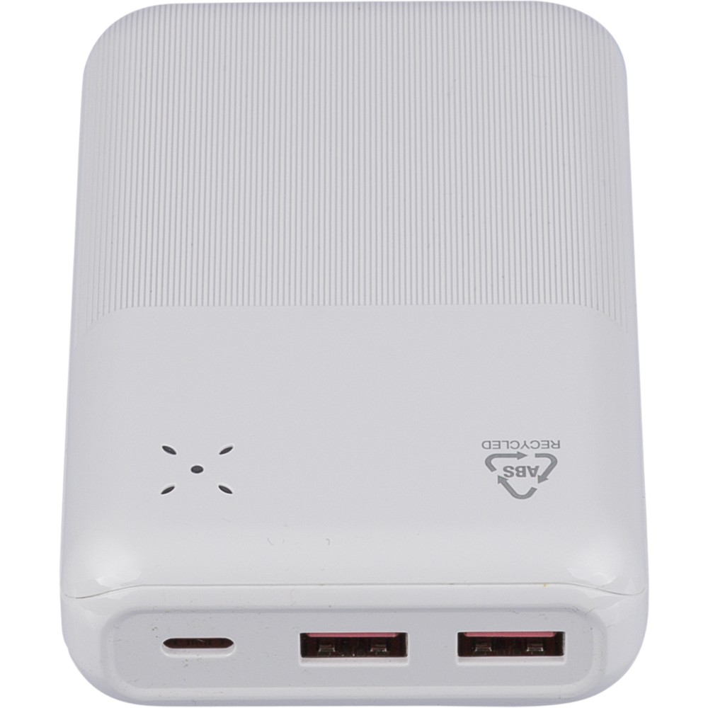 Újrahasznosított ABS anyagból készült powerbank 20 000 mAh kapacitással és 22,5 W gyors töltési teljesítménnyel. Type-C in/out és Type-A bemenettel, LED visszajelzővel és biztonsági védelmekkel. A hátoldalon gravírozott recycled (újrahasznosított) alapanyagra utaló logó található. Selyempapírral bélelt barna dobozba csomagolva.