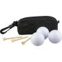 RPET anyagból készült, cipzáras tasakban elhelyezett golfkészlet PP karabinerrel, 3 gyakorló golflabdával és 3 darab bükkfából készült golftee-vel. A tasakon rPET címke található