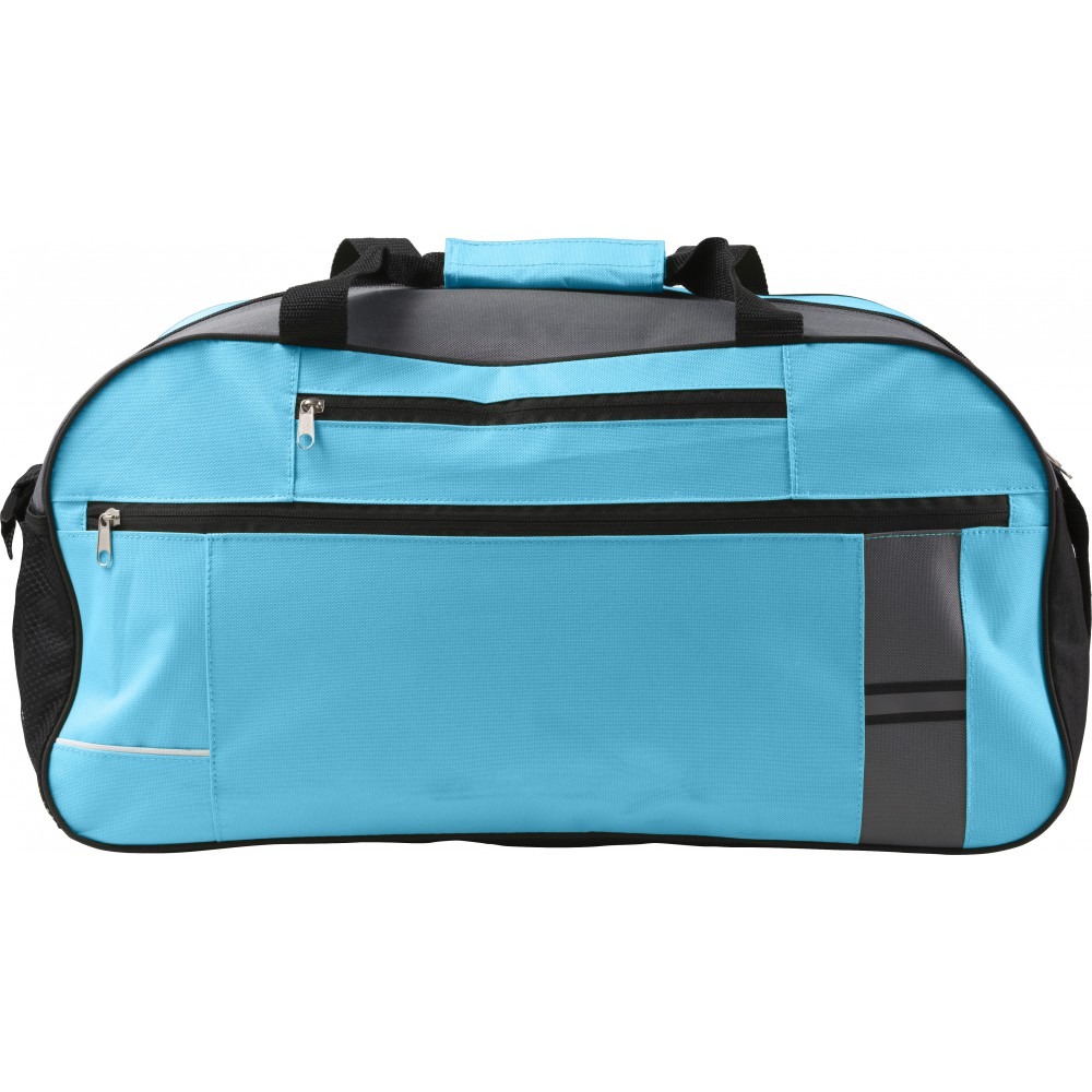 Utazótáska több cipzáros zsebbel, fényvisszaverő csíkkal, állítható vállpánttal. 600D poliészter.