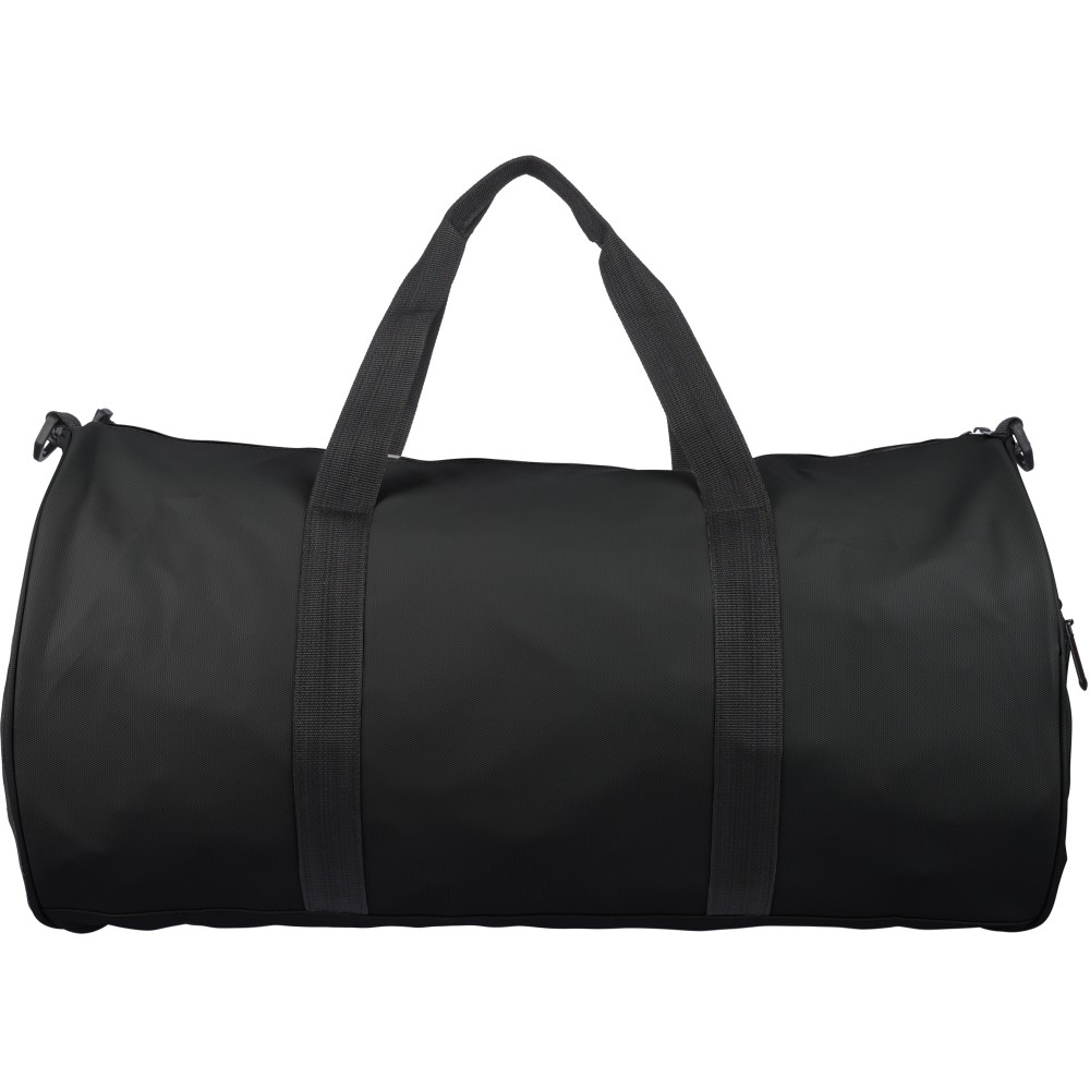 600D poliészterből készült rPET sporttáska 210D béléssel és vízlepergető PU bevonattal, 40 literes űrtartalommal. Elülső és oldalsó cipzáras zsebbel, hálós oldalzsebbel, két fogantyúval és állítható vállpánttal rendelkezik. Külső felületén rPET címkével ellátva.