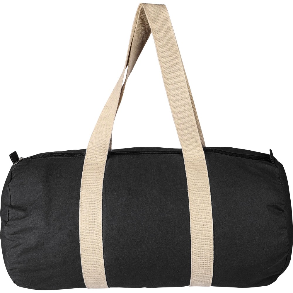 Oeko-Tex minősítésű, 180 g/m2 pamutból készült színes, cipzáras sporttáska 60 cm hosszúságú és 5 cm szélességű natúr pamutfülekkel. Oeko-Tex címkével ellátva.